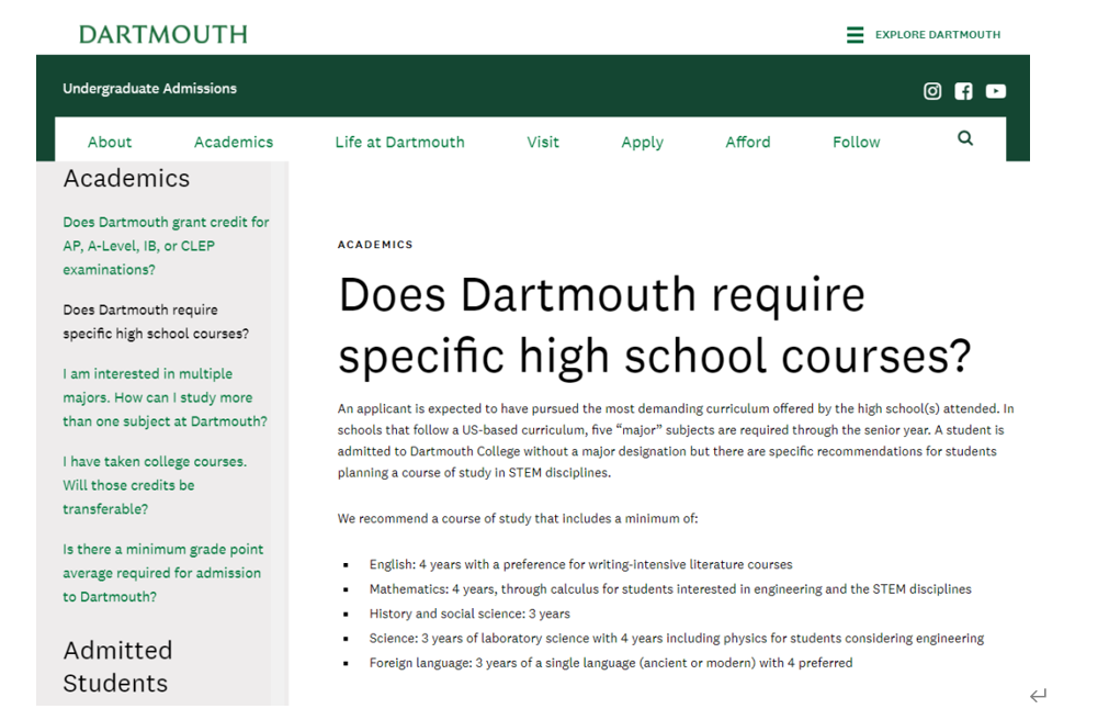 数学**** 典型的数学课程包括代数 1 、几何、代数 2 、微积分预科和微积分。建议尽早选这些数学课程,为你高中的高等数学和科学课程做准备。大多数大学要求学生学习 3 年的高中数学,一些大学要求学生学习 4 年的高中数学。 比如:达特茅斯学院