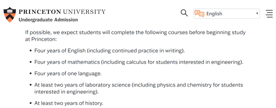 比如: 普林斯顿大学 · 四年数学 ( 对工程感兴趣的学生建议学习微积分 ) ; · 四年英语; · 四年外语; · 至少两年实验科学(对工程学感兴趣的学生应该学习物理和化学); · 至少两年历史。