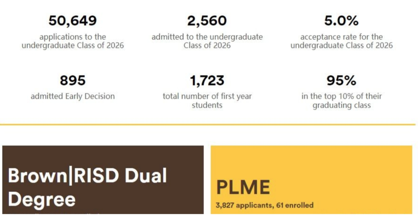 布朗大学2026届有50,649人申请,早申录取895人,2026届录取2,560人,整体录取率只有5%,创历史新低。95%被录取的新生班级排名前10%。