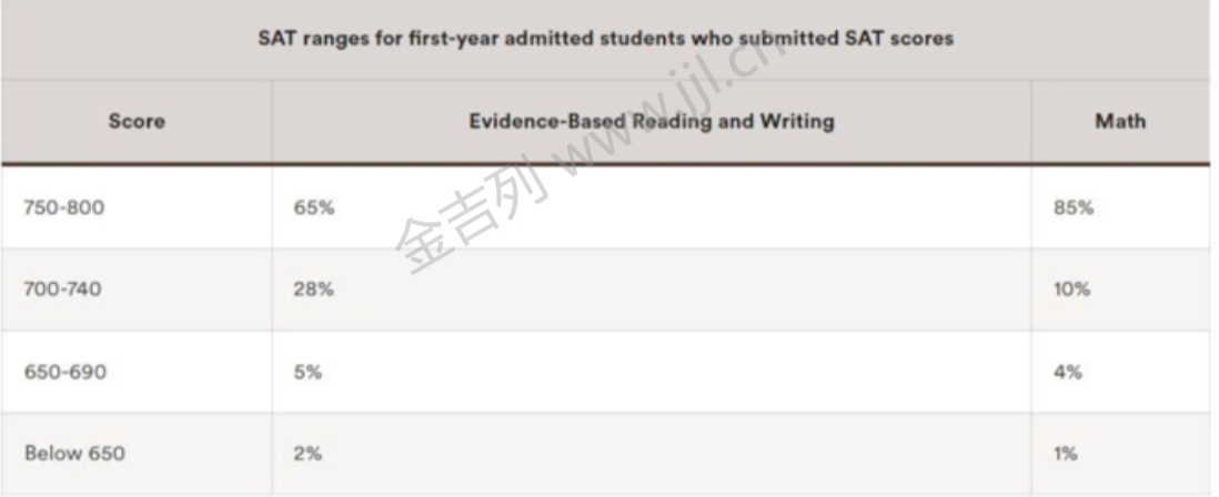SAT成绩,超过93%的申请者阅读在700以上,85%的申请者数学在750以上。