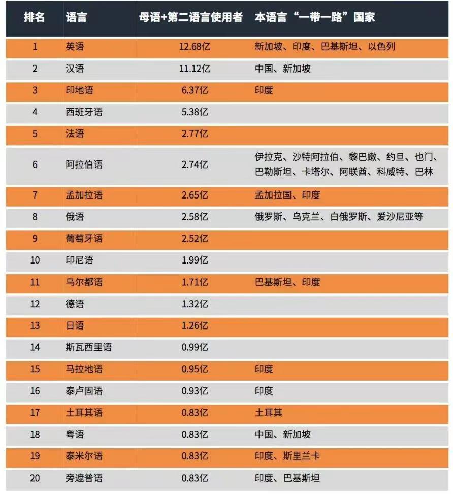 决定一个专业不仅是对大学四年许下承诺,它更是未来职业的指南针和认知世界的度量尺。因此,我们并不推荐过于小众的小语种,因为它们面临的不仅是教育资源的匮乏,职业上通常也有诸多局限。以下我们列举了世界上最流行的20种语言,并标注了其中对应的“一带一路”国家,帮助你做更好的参考: