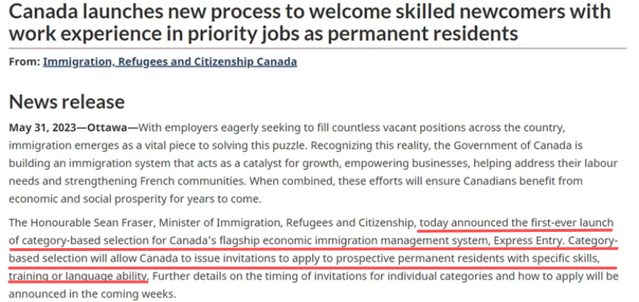 2023年5月31日,加拿大移民部宣布正式推出基于类别的选择(category-based selection),并且今年将重点有针对性地从EE(Express Entry,简称EE)通道中抽选:医疗、STEM、建筑、运输、农业等5类专业人才。
