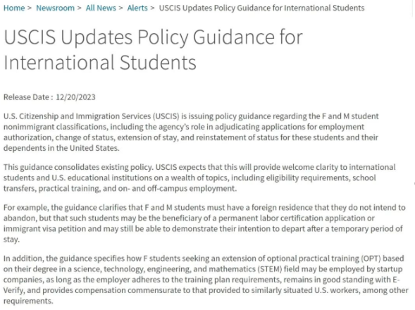 美国公民及移民服务局(USCIS)在12月20日发布了关于F和M类非移民国际留学生的最新政策指南简短更新,为国际学生提供更明确的留学和就业指导。
