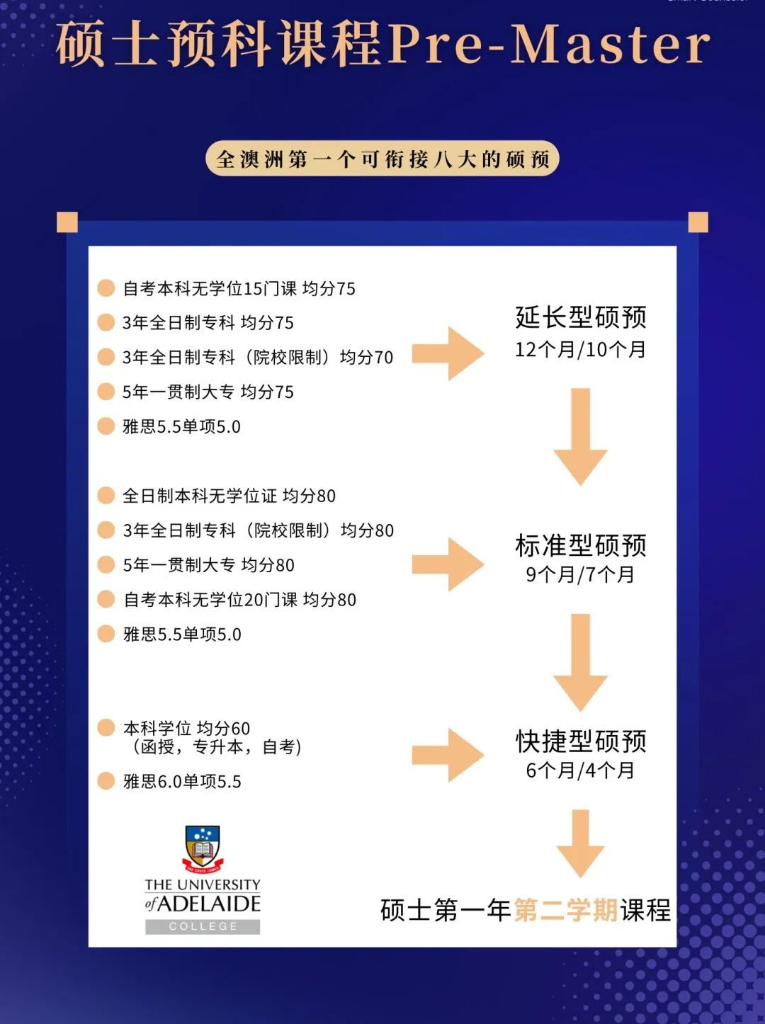 阿德莱德大学学院是全澳洲第一个可衔接八大的硕预,学生可以在完成学院课程后顺利升入阿德莱德大学硕士课程继续学习。