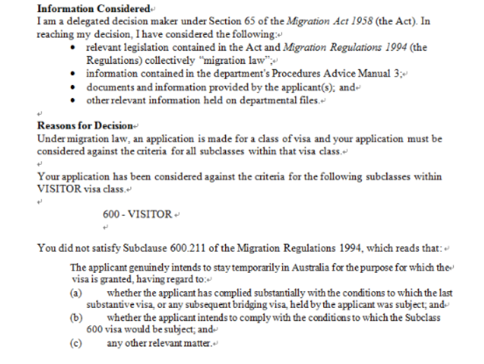 例如,前几天有一个在途家长愁眉苦脸得找到我,说因为自己图便宜找旅行社办理赴澳的旅游签证被使馆拒签了,拒签的理由是怀疑申请人没有足够得经济能力,也没有回国得动机,最终导致拒签 。说白了,签证官怀疑家长有很大的(非法的方式)留在澳洲的可能性,所以就直接拒签了,拒签信截图如下: