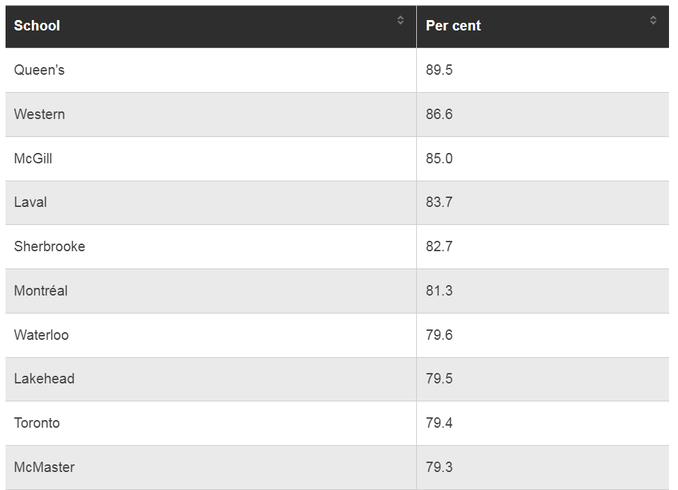 榜单显示, 在加拿大最容易毕业的三所学校分别是女王大学、韦仕敦大学和麦吉尔大学 。