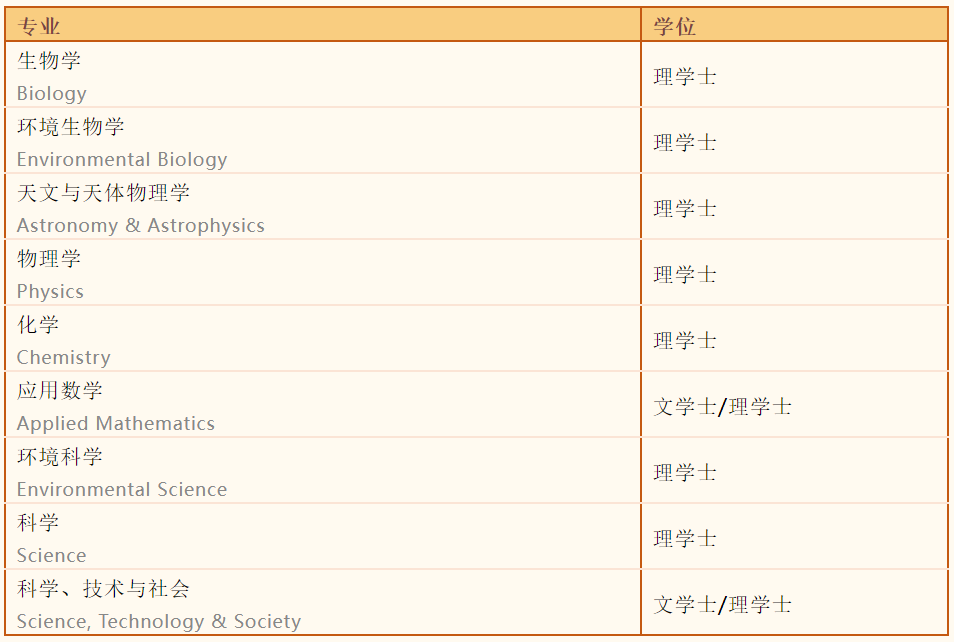理学士Bachelor of Science (BSc):学生除了要求专业课程外,要求学生掌握基础的数学,物理,化学,和生物。