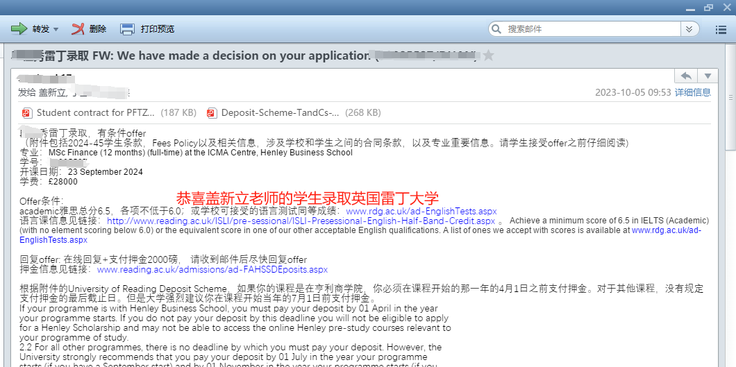 学生:双非一本,均分85分,申请时无雅思,录取英国雷丁大学。