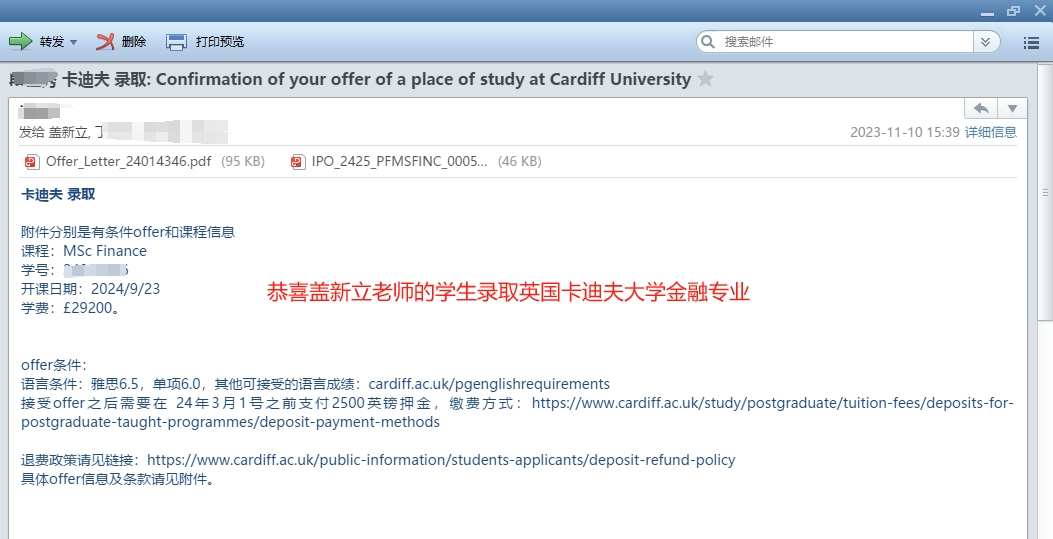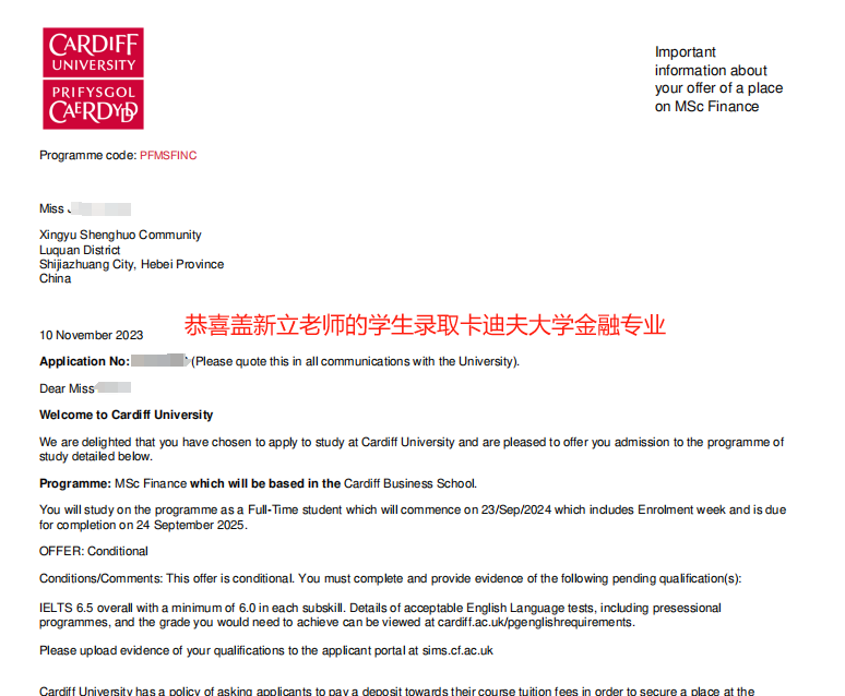 学生背景:双非一本,均分85,申请时无雅思,录取英国卡迪夫大学金融专业。