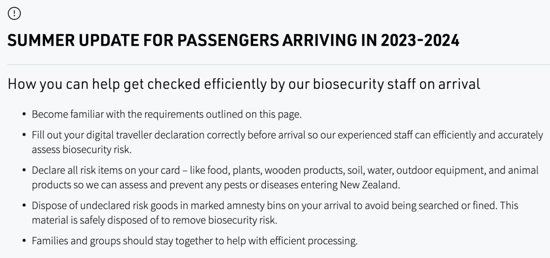 新西兰初级产业部表示,不可能列出所有被视为风险的物品,因为物品的风险并不总是相同。这取决于产品的来源国、成分或包装等因素。如果您不确定您携带的物品是否能入境, 请主动提前如实申报。