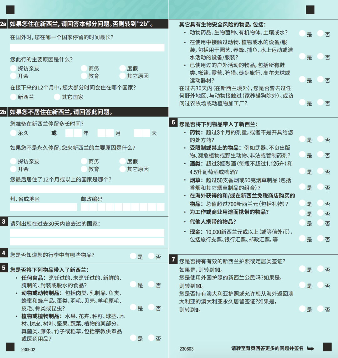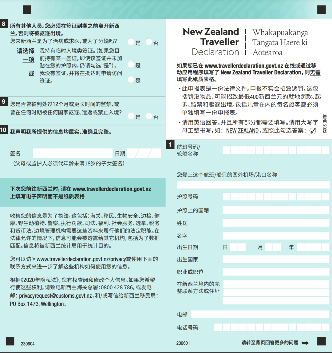 所有前往新西兰的旅客必须在到达新西兰之前填写新西兰旅客声明。您可以在NZTD网站 (TravellerDeclaration.govt.nz)上填写数字声明。
