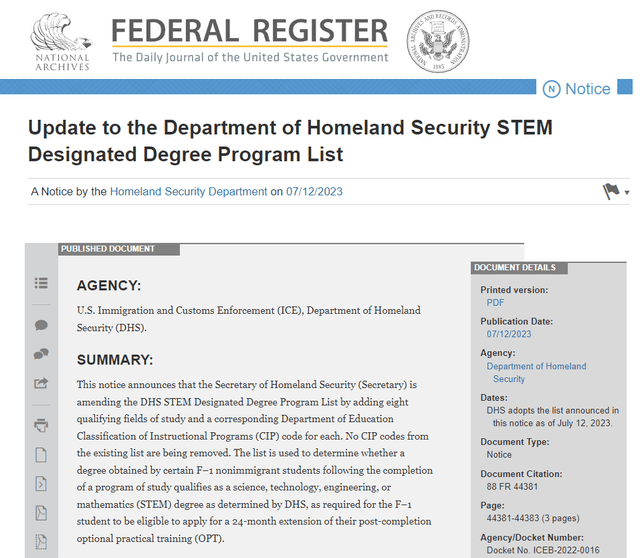 根据《联邦公报》近期消息, 美国国土安全部和移民局联合宣布了对STEM专业范围修订的消息,其中涉及到新增8个专业领域的决定。 该决定的宣布意味着,这些专业将具备申请24个月的OPT延期资格。