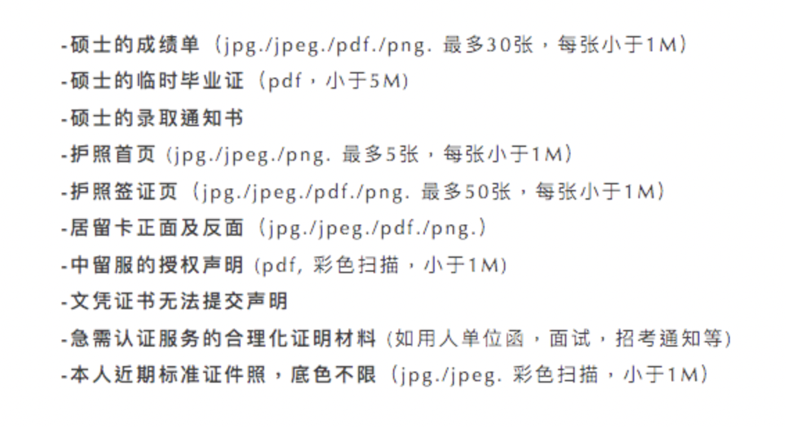 材料要求详情: 想要快速的申请中留服的学历认证,首先要准备好10样材料的电子版或扫描件(一些材料如有特殊情况,请以中留服官网要求为准)