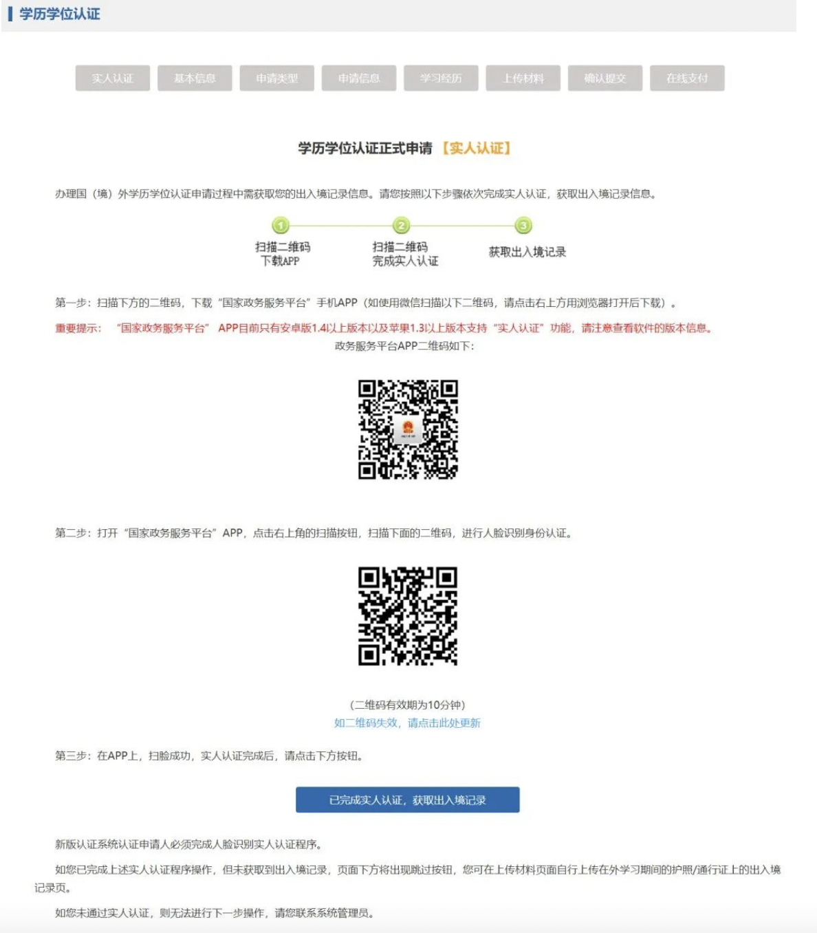 2.完成人脸验证。 点击 “已完成实人认证,获取出入境记录” ,确认出入境记录无误,点击下一项。 随后,按要求完成 “基本信息” ,确认信息无误点击保存,再进入下一步。