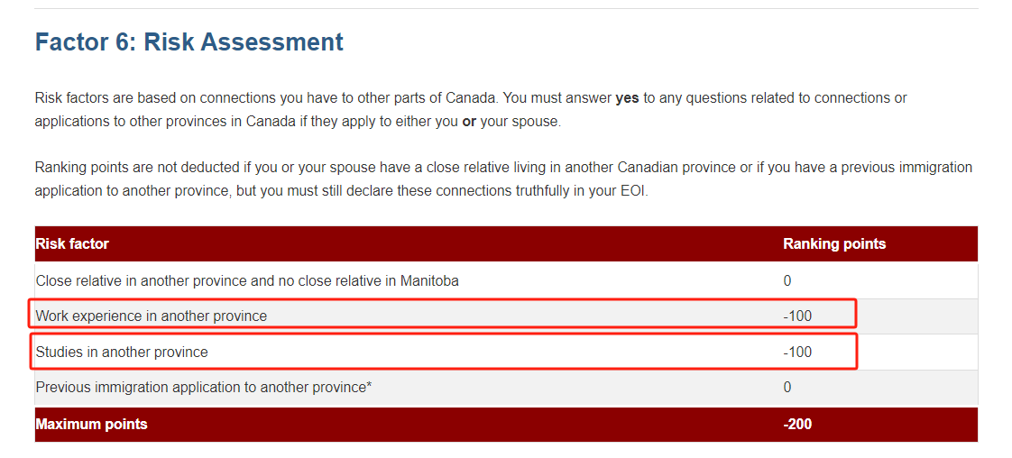 曼省的打分制里, 请留意在外省有工作和学习经历的申请人,会被分别扣掉100分 ,所以总体来说,该打分系统对直接在曼省读书并毕业的申请人更友好。