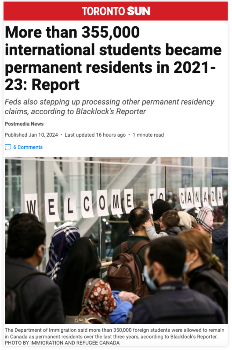 据多伦多太阳报引述Blacklock’s Reporter报道,移民部在一份写给国会公共账目委员会的信件中表示:“在过去三年里,超过 627,000 名前TR临时居民成为PR永久居民”。