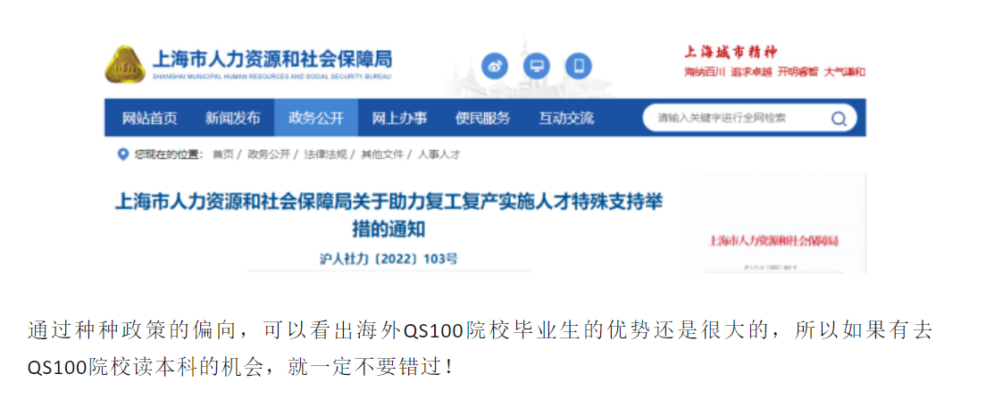 例如上海市的人才引进政策规定,对于世界排名 TOP50 院校的毕业生,取消社保缴费基数和时间要求,全职在沪工作即可直接申办落户; TOP51~100 院校的毕业生,社保交满 6 个月后也可以直接申办落户。