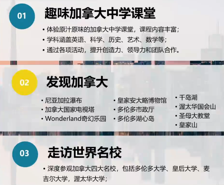 2周体验加拿大中学课堂,课程内容包括英语、科学、历史、艺术等;