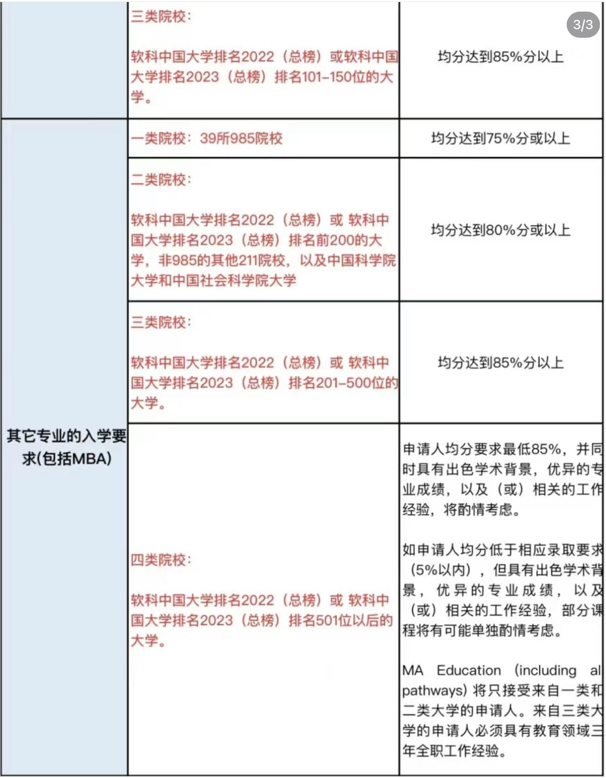 2) MA Education (including all pathways) 只接受来自一类和二类大学的申请人。来自三类大学的申请人必须具有教育领域三年全职工作经验。
