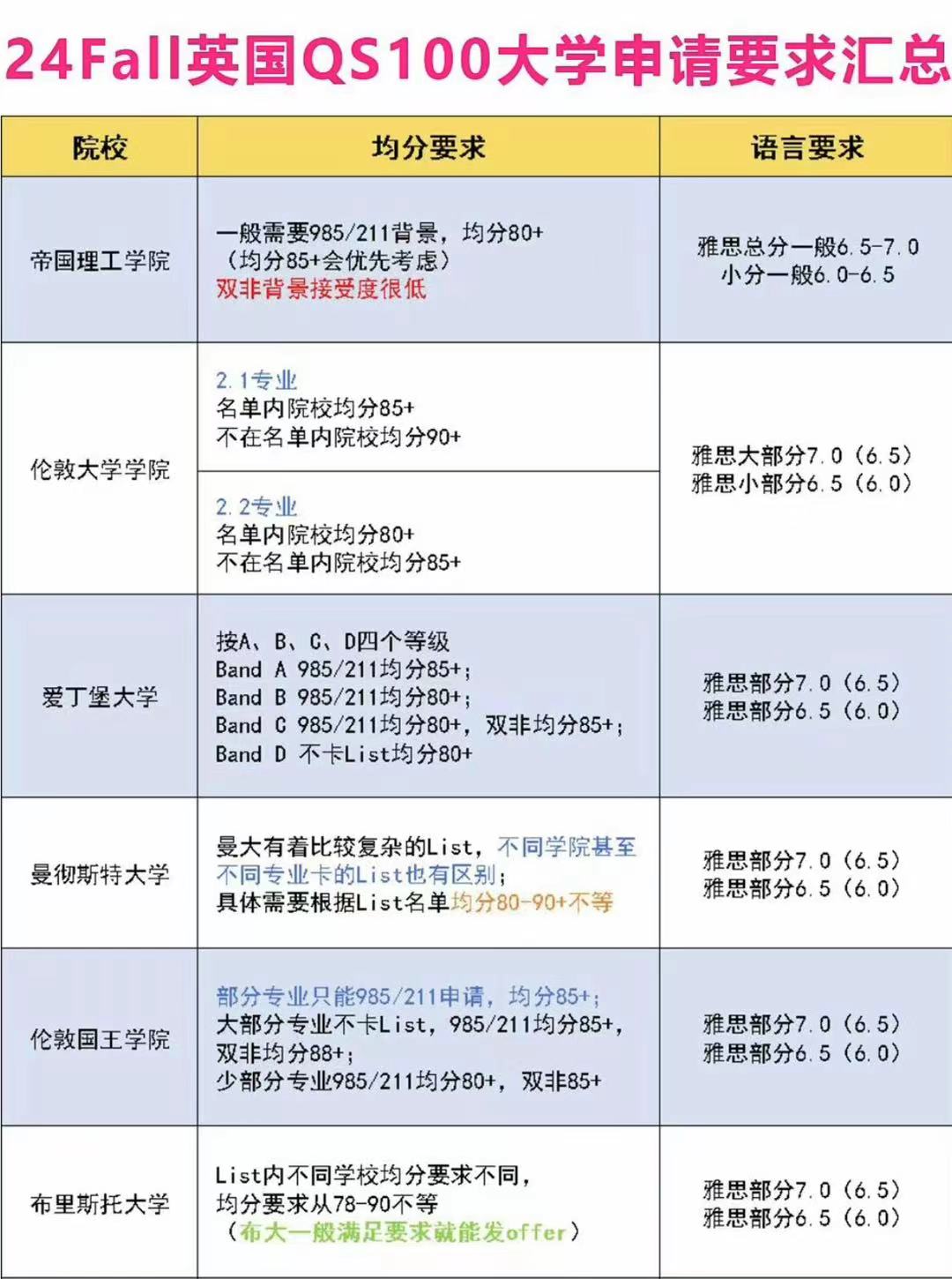 24年Fall英国院校的申请要求基本如图所示