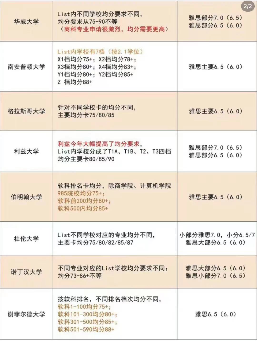 整体来看今年英国院校的申请有些两极化,前50在不断提高门槛,50-100的学校却有几个在降低要求,对于大部分想要留学的学生来说是利好消息,申请50-100的学校难度有所降低~