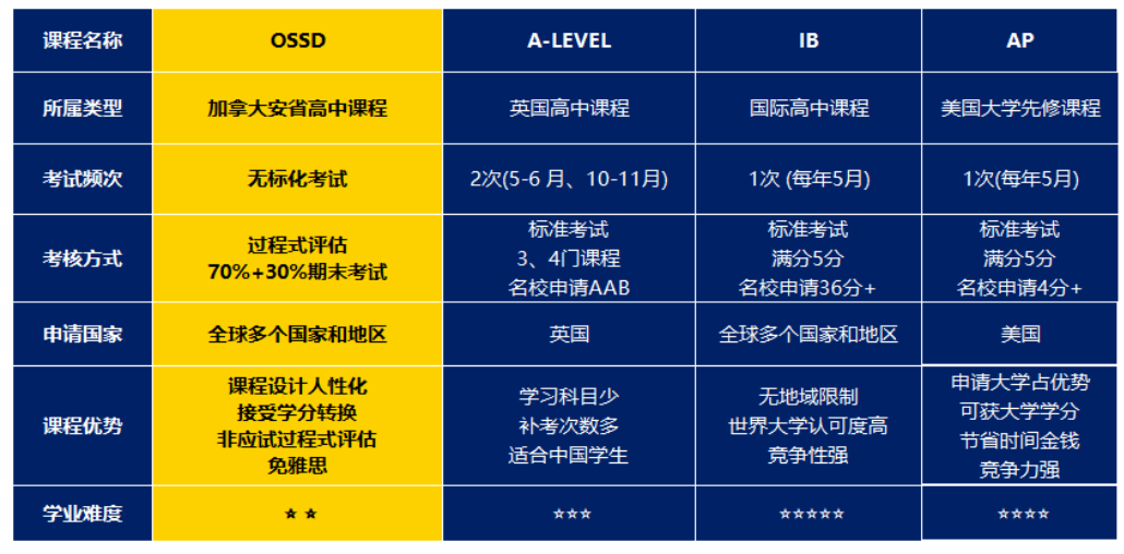 A-Level/AP/IB均为国际课程体系,成绩可以用来申请世界各地学校,全球认可,其中 A-Level/AP/IB有大考 ,学生需要在大考中取得优异成绩来申请大学; OSSD没有大考 ,以12年级所学课程的平均分来申请大学,一定程度上可以避免 一考定终身 。