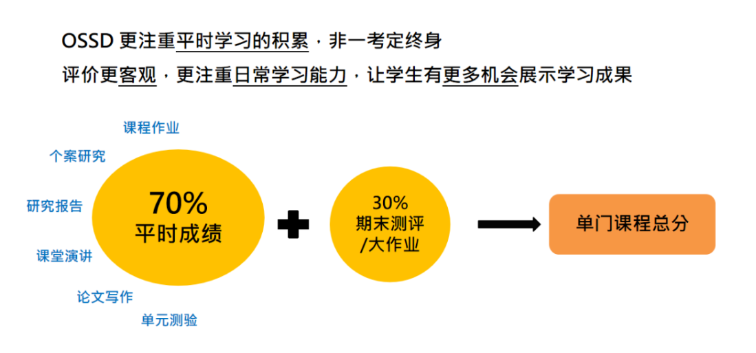 OSSD是采用过 程式评估来 代替标准考试型升学模式,每门课程成绩是按 70%平时成绩+30%期末成绩 ,考试压力小,给予学生更大的发展空间。