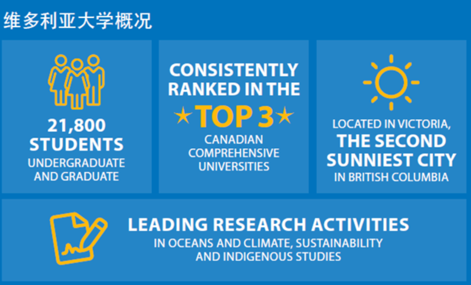 维多利亚大学 (University of Victoria) 创建于 1916 年,是加拿大顶尖综合类研究大学之一,也是规模最大的综合性大学之一,常年位居综合类排名前 2 名,位于不列颠哥伦比亚省的省会维多利亚市。维多利亚大学在内城和西部共有 15 个校园,附属的有温哥华音乐学院和通讯法研究中心。对于海外学生来讲,维多利亚大学被认为是加拿大高等教育、专业培训和语言强化课程等方面最富有革新精神的大学之一。国际生比例达到 7% 。在高排名大型公立院校当中,维多利亚大学的国际学生服务不仅规范严谨,且多年来保持着友善、可靠、稳定。