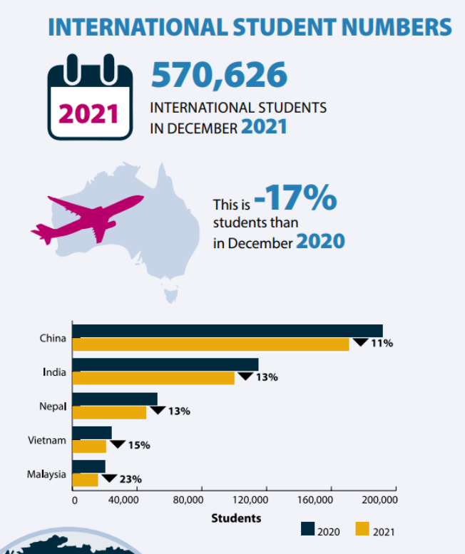 根据澳大利亚政府教育部官网2020/21年度数据,澳洲所有持学生签证赴澳留学的海外学生总数为570,626人,相比前一年降低17%!中国学生人数也降低11%!同期,印度、尼泊尔、越南和马来西亚这些主要留学生来源国学生人数都在下滑……