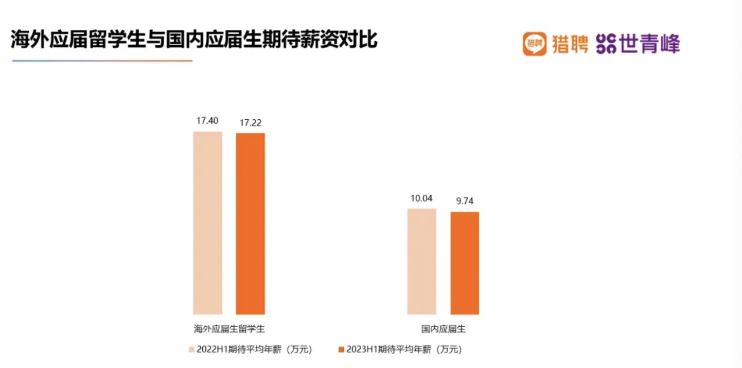 海外应届留学生期待薪资微降至17.22万元,比国内应届生高7.48万。