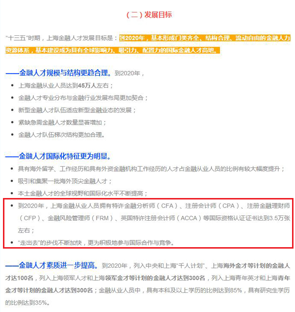 按照上海市建设国际金融中心的战略目标,上海拟吸引CFA/CPA/ACCA等国际资格认证证书3.5万张,且紧缺程度均为最高级别3颗星!!!