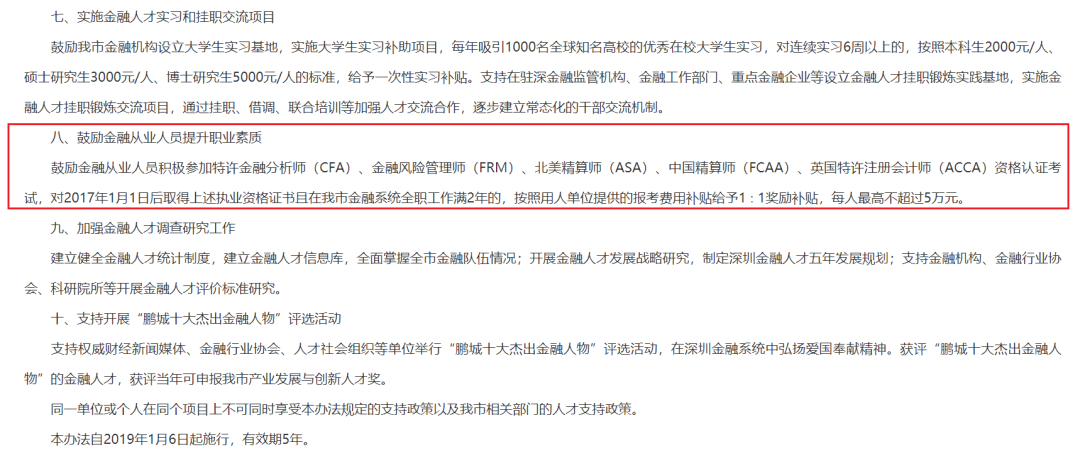 深圳市鼓励金融从业人员积极参加特许金融分析师(CFA)、金融风险管理师(FRM)、北美精算师(ASA)、中国精算师(FCAA)、英国特许注册会计师(ACCA)资格认证考试