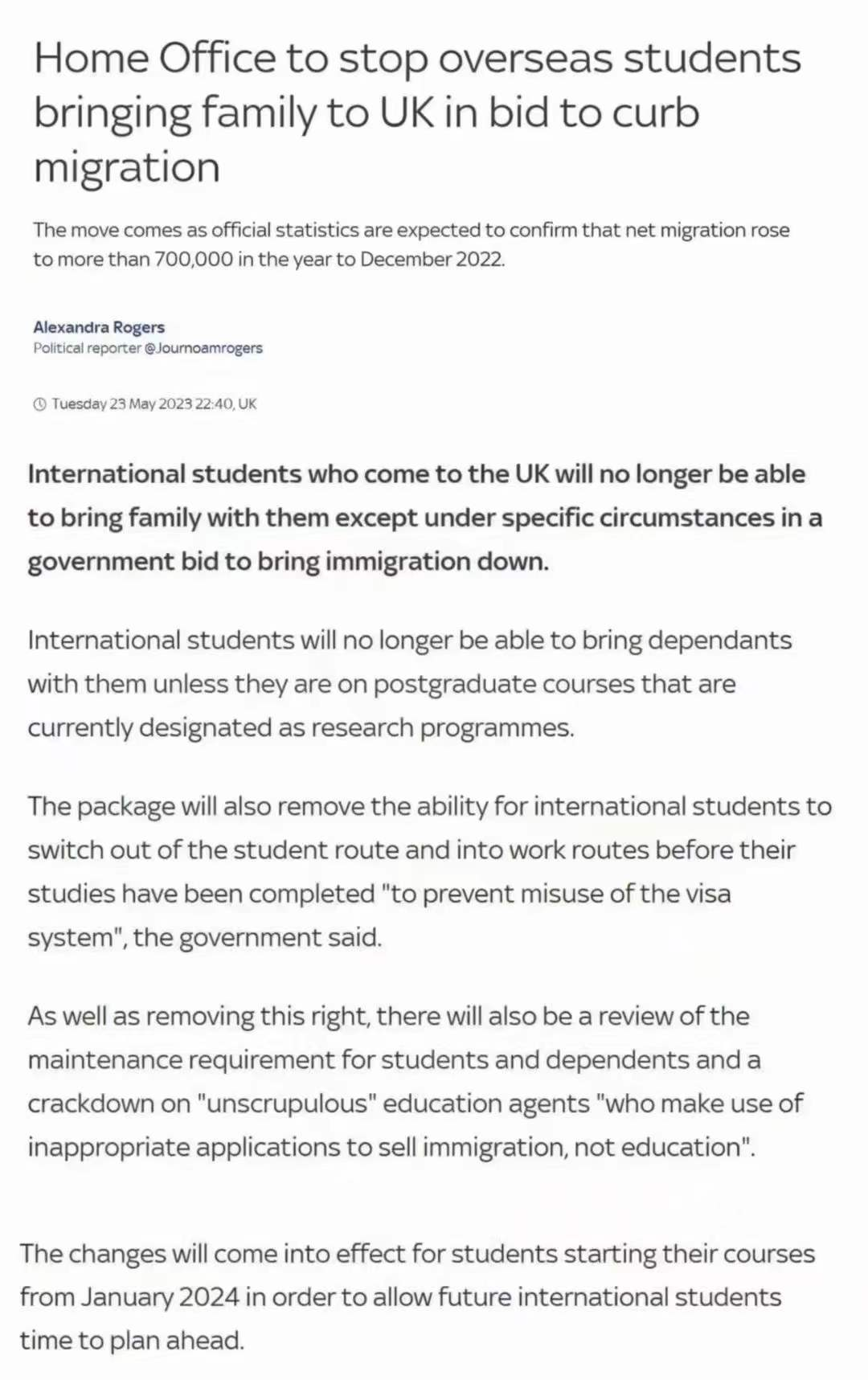 英国政府宣布:自2024年1月入学开始,不再允许学生签证申请人携带家属(配偶及未成年子女)以陪读名义入境英国,除非是攻读研究型硕士或博士课程的学生。