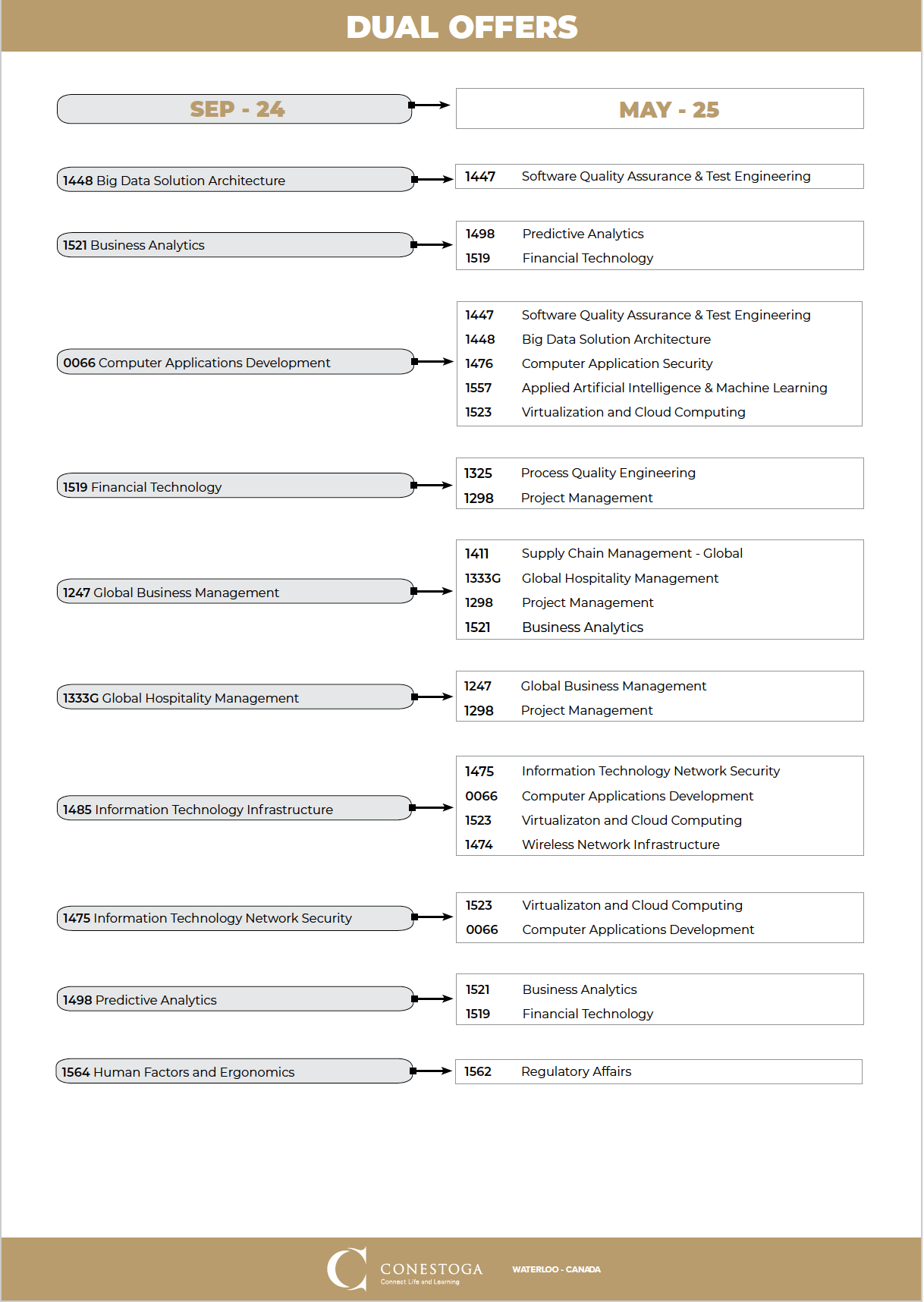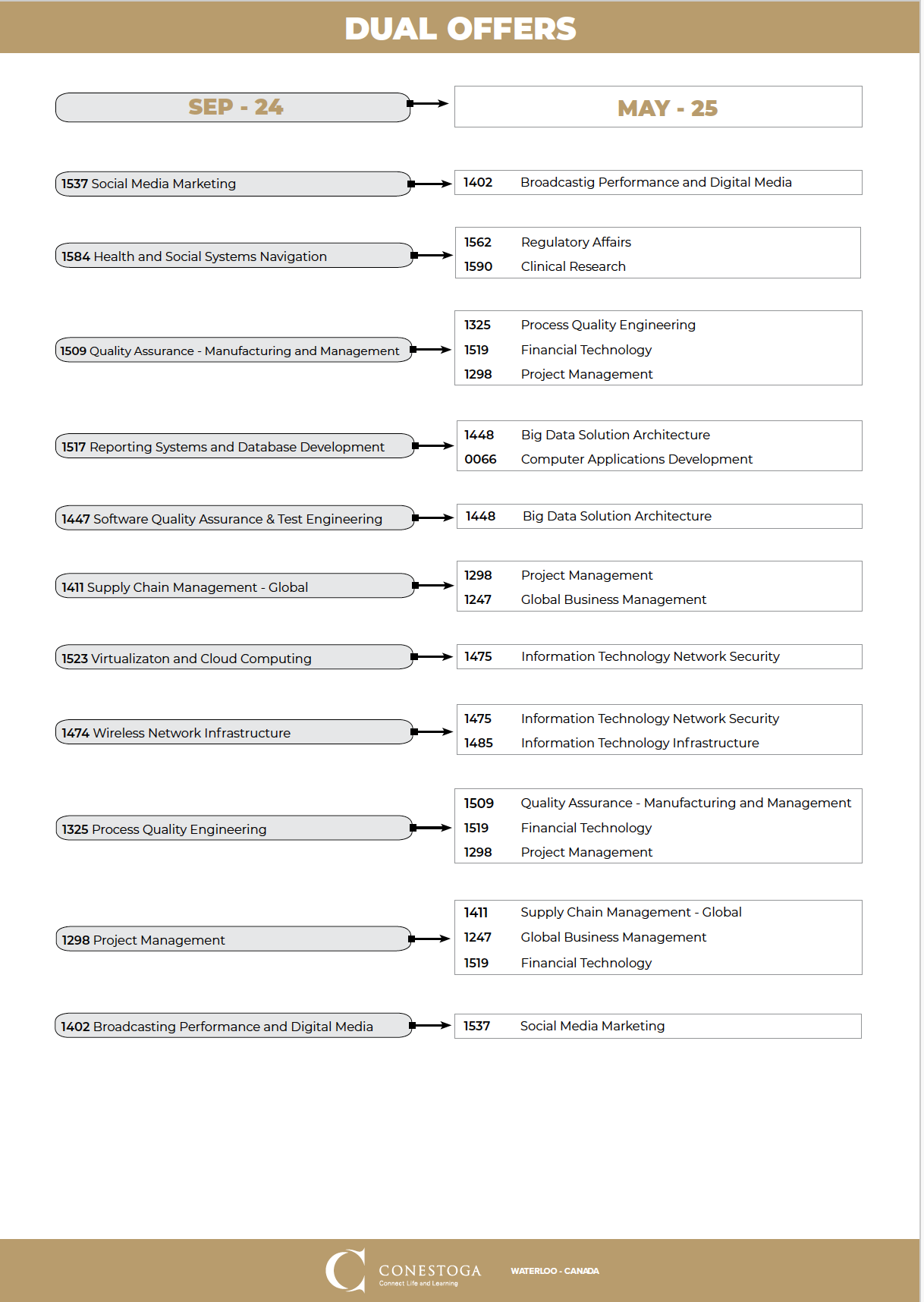 Conestoga College 作为安大略省开设研文专业最多的学校之一,除了大量2年制研文专业可供国际学生选择外,我们将继续实行1年制研文+1年制研文双专业录取OFFER的便利政策!