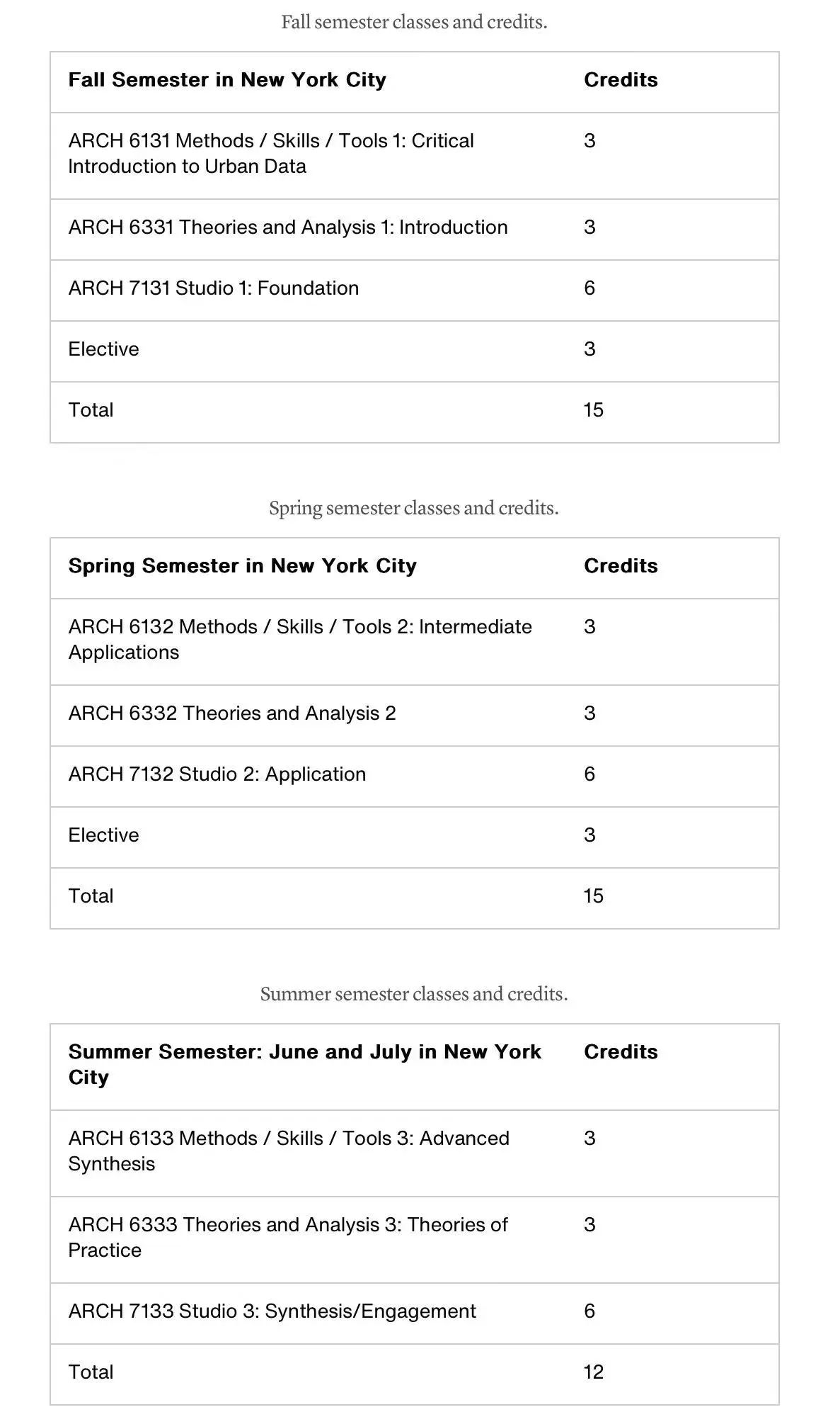 第二个优势是 由短学制造成的紧凑课程,使得课程安排上大量由项目制课程构成,很少安排单独的基础类课程。比如下图为康奈尔大学的 高级城市设计专业硕士专业的课程安排: