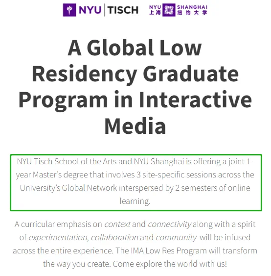 还有一个比较特殊,那就是纽大的IMA Low Residency Program。 该项目是纽约大学Tisch艺术学院与上海纽约大学创办的联合项目,全程12个月(7月~次年7月), 以线上课程为主,线下部分会分别去到纽约(7~8月)、柏林(1月)和上海,毕业后能够获得受中国教育部承认的纽约大学硕士学位。