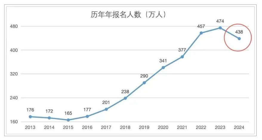 据统计,2024年研究生考试报考人数为438万。较上一年减少36万人,减少了7.59% ,这也是自2015年以来考研人数的首次下降。