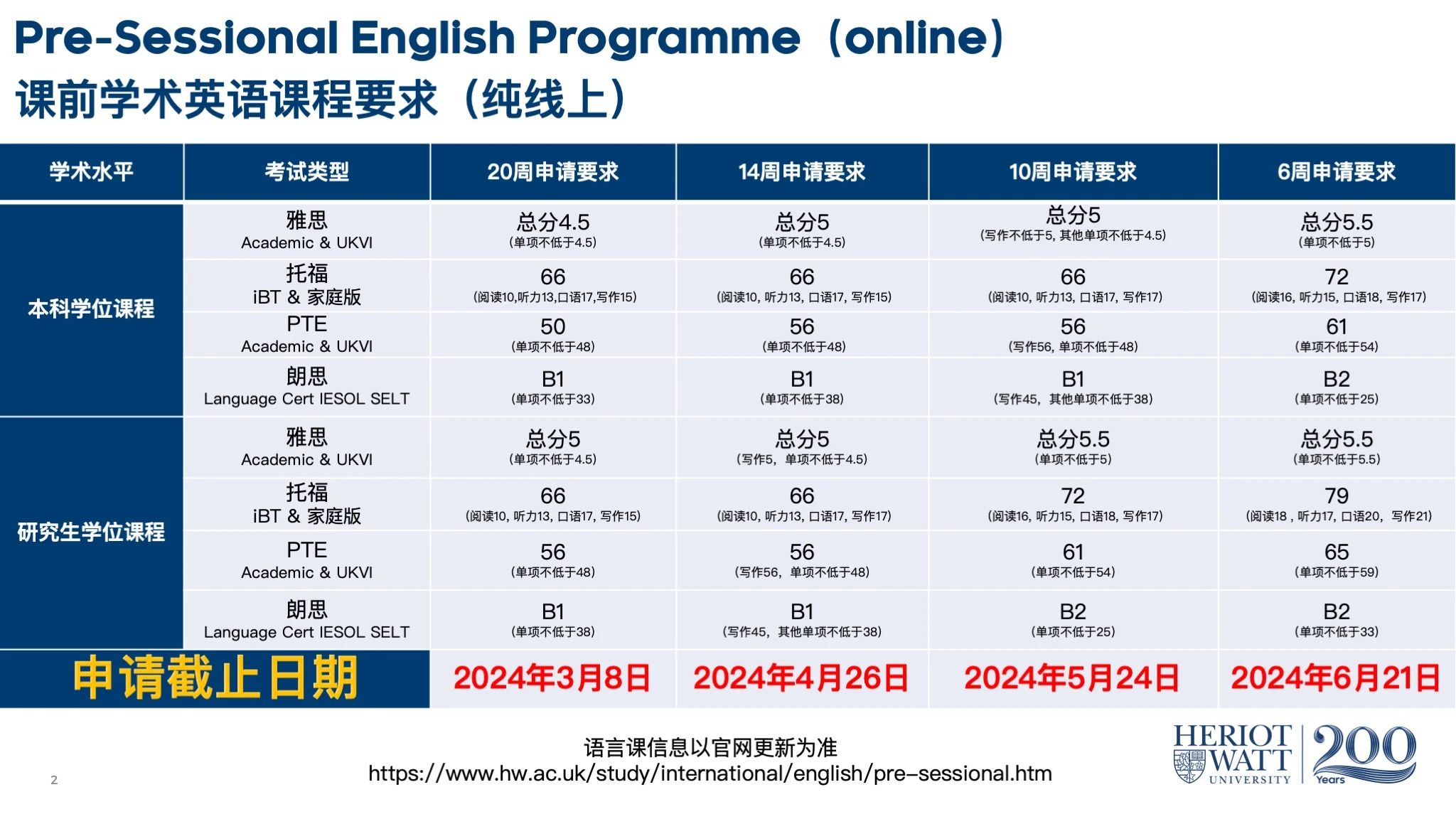 选择线上线下混合模式学习的同学需要使用赫瑞-瓦特大学认可的UKVI的SELT的语言成绩进行申请。(详情请见下面表2)