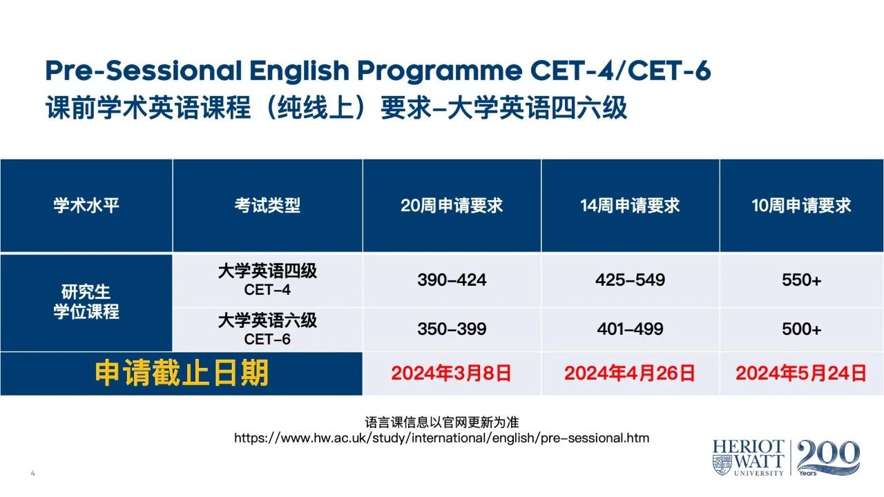 选择纯线上模式的同学, 可使用 包括英语四六级在内 的赫瑞-瓦特大学认可英语语言考试成绩 以及大学自己的内测考试来进行申请。
