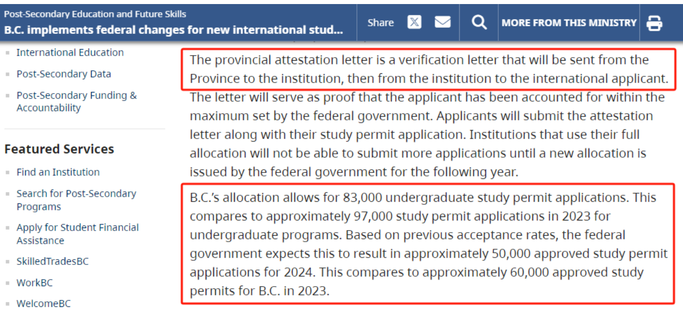 而国际学生最关注的BC省2024年学签申请配额的数量,也终于出炉了!发布中公示,BC省获得的配额允许接收83000份大学本科学习许可申请,而2023年,BC省则有97000份本科课程的学习许可申请。此次BC省发布的消息中还明确了省内公立高等院校和私立教育机构可获得PAL的分配比例为公立53%,私立47%;同时再次强调, 这个分配比例仅是基于联邦政府设定的PAL配额,并不代表获批的学习许可!