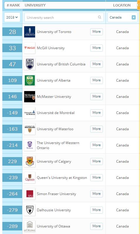 以上是最新的2019年加拿大大学世界排名,麦吉尔大学、英属哥伦比亚大学、多伦多大学仍然世界排名前50,欢迎来自全国各地的学霸来申请!世界前300的大学基本都是建校史百年以上,科研水平非常之高,国内的同济大学世界排名291,西安交通大学313,南开大学338,都是及不上加拿大的大学,国内的高中生毕业凭借平时成绩,会考成绩也雅思成绩是可以申请到比以上大学更好的大学,所以有志出国的学生们一定要把眼光放长远哦,加拿大会是你不二的选择!