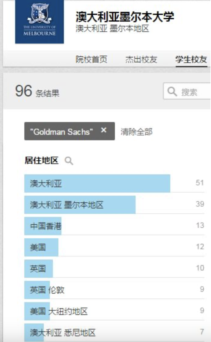 墨尔本大学的学生去具体的一个公司的情况,就以金融行业里面竞争最激烈的一类公司——投资银行中排名全世界第一的高盛(GolmanSachs)为例,数据来源还是世界公认的最大职业社交网站Linkein。