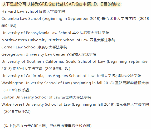 好打算申请J.D专业,却被LSAT(Law School Amission Test)困住?还在黯然神伤?来,你看,好消息来了! 近来,美国多个知名法学院宣布他们的 J.D. 项目可以接受用 GRE 考试成绩代替 LSAT 考试成绩啦。目前为止,已经有 20 多所法学院宣布可以接受 GRE 考试成绩作为入学审核标准之一。