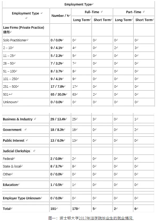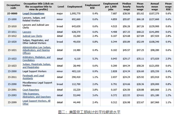 法学院的毕业生就业前景也是非常光明。根据各大法学院的毕业生就业去向统计,法学院毕业生就业领域一般为律所,政府部门,公司,司法部门,以及学术界。图一为波士顿大学法学院2017年毕业生在毕业后10个月内的就业情况。作为高薪行业,法律从业人员的薪资也是非常可观。图二为美国劳工部统计的法律从业人员的平均薪资,供大家了解。