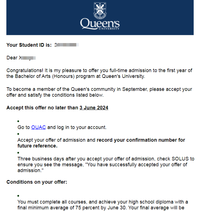 在我们的专业规划和建议下,学生于2023年11月开始进行多大、麦吉尔的申请递交。并且在2024年初1月份,学生雅思尚未出分的情况下,建议递交了女王大学、韦仕敦大学和约克大学的双录取,确保孩子能拿到学校的录取。