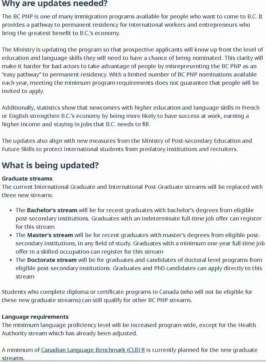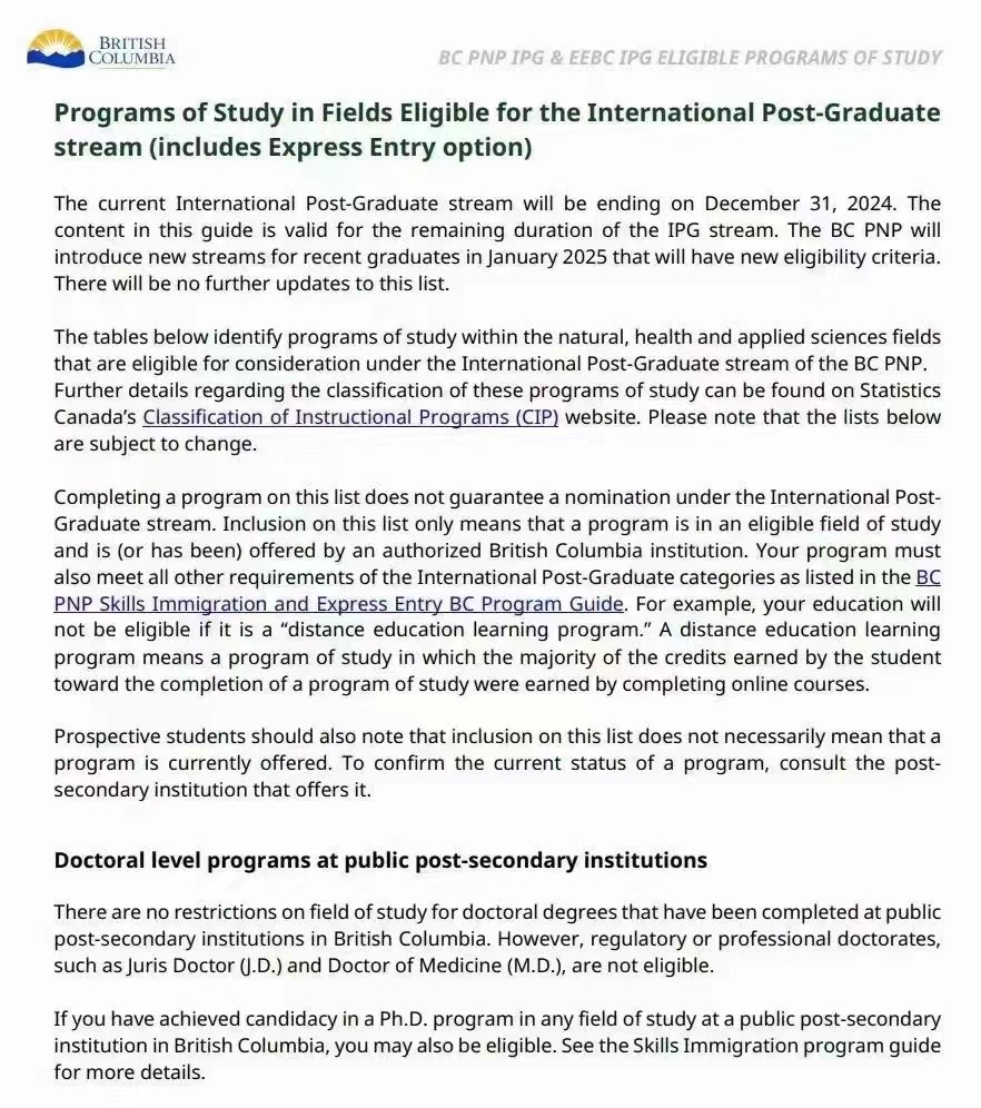 目前BCPNP现有的硕博项目依然有效,将于2024年12月31日结束。2025年1月会公布新的类别和细则~