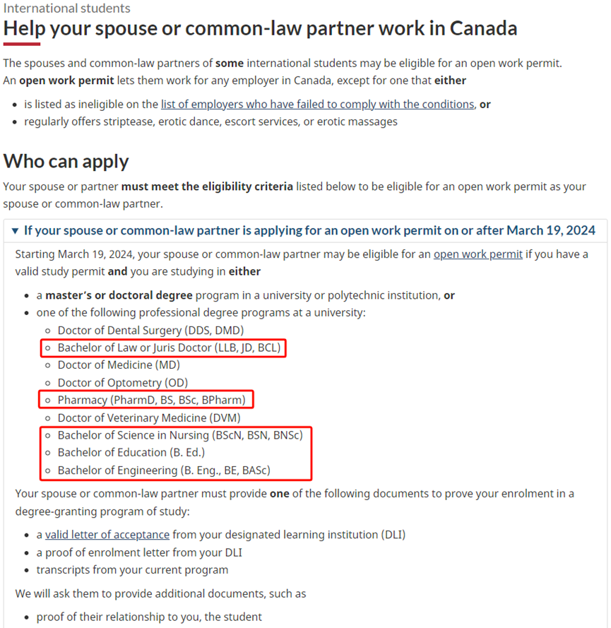 除硕士、博士和部分本科专业学位外的学签持有人,从3月19日起不能再为配偶申请开放工签,3月19日之前提交的申请不受影响,已有工签续签不受影响。