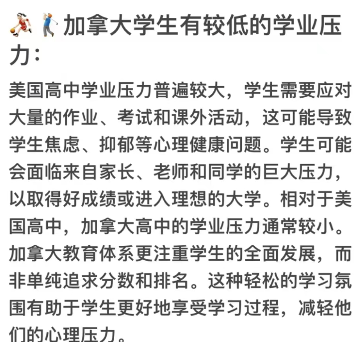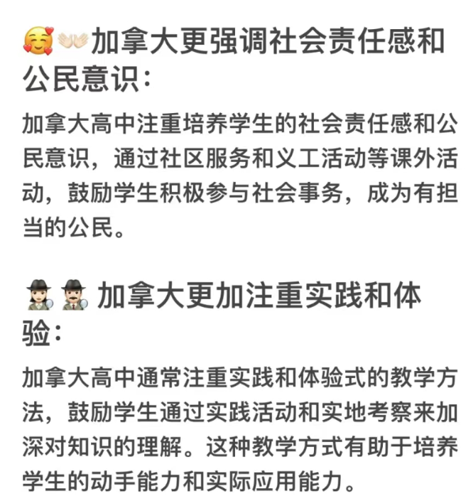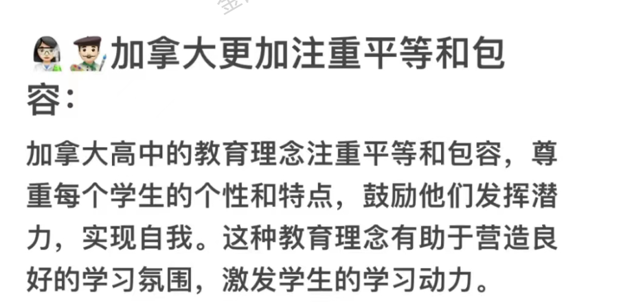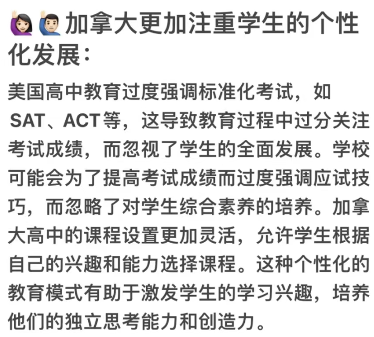 加拿大更加注重学生的个性化发展:美国高中教育过度强调标准化考试,如SAT、 ACT等,这导致教育过程中过分关注考试成绩,而忽视了学生的全面发展。学校可能会为了提高考试成绩而过度强调应试技巧,而忽略了对学生综合素养的培养。加拿大高中的课程设置更加灵活,允许学生根据自己的兴趣和能力选择课程。这种个性化的教育模式有助于激发学生的学习兴趣,培养他们的独立思考能力和创造力。