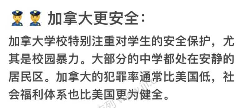 加拿大学校特别注重对学生的安全保护,尤其是校园暴力。大部分的中学都处在安静的居民区。加拿大的犯罪率通常比美国低,社会福利体系也比美国更为健全。