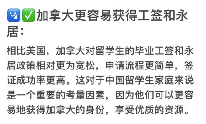 相比美国,加拿大对留学生的毕业工签和永居政策相对更为宽松,申请流程更简单,签证成功率更高。这对于中国留学生家庭来说是一个重要的考量因素,因为他们可以更容易地获得加拿大的身份,享受优质的资源。